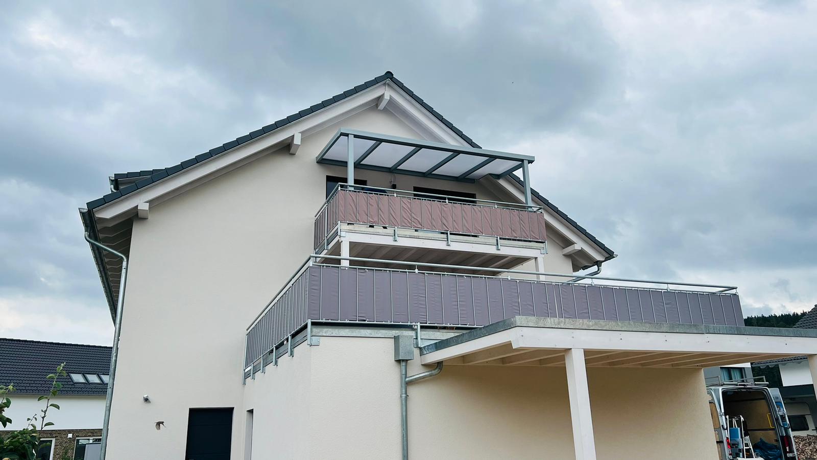 Für ein Mehrfamilienhaus in Donaueschingen haben wir eine moderne Balkonüberdachung in Grau realisiert. Die Konstruktion besticht durch eckige Pfosten, eine eckige Regenrinne und eine hochwertige VSG-Matteindeckung, die blendfreies Licht auf den Balkon bringt und gleichzeitig optimalen Schutz vor Regen bietet. Die stabile Aluminiumkonstruktion sorgt für Langlebigkeit, Pflegeleichtigkeit und ein stilvolles Erscheinungsbild. So entsteht ein komfortabler Außenbereich für alle Bewohner, der Schutz, Design und Funktionalität perfekt miteinander vereint.