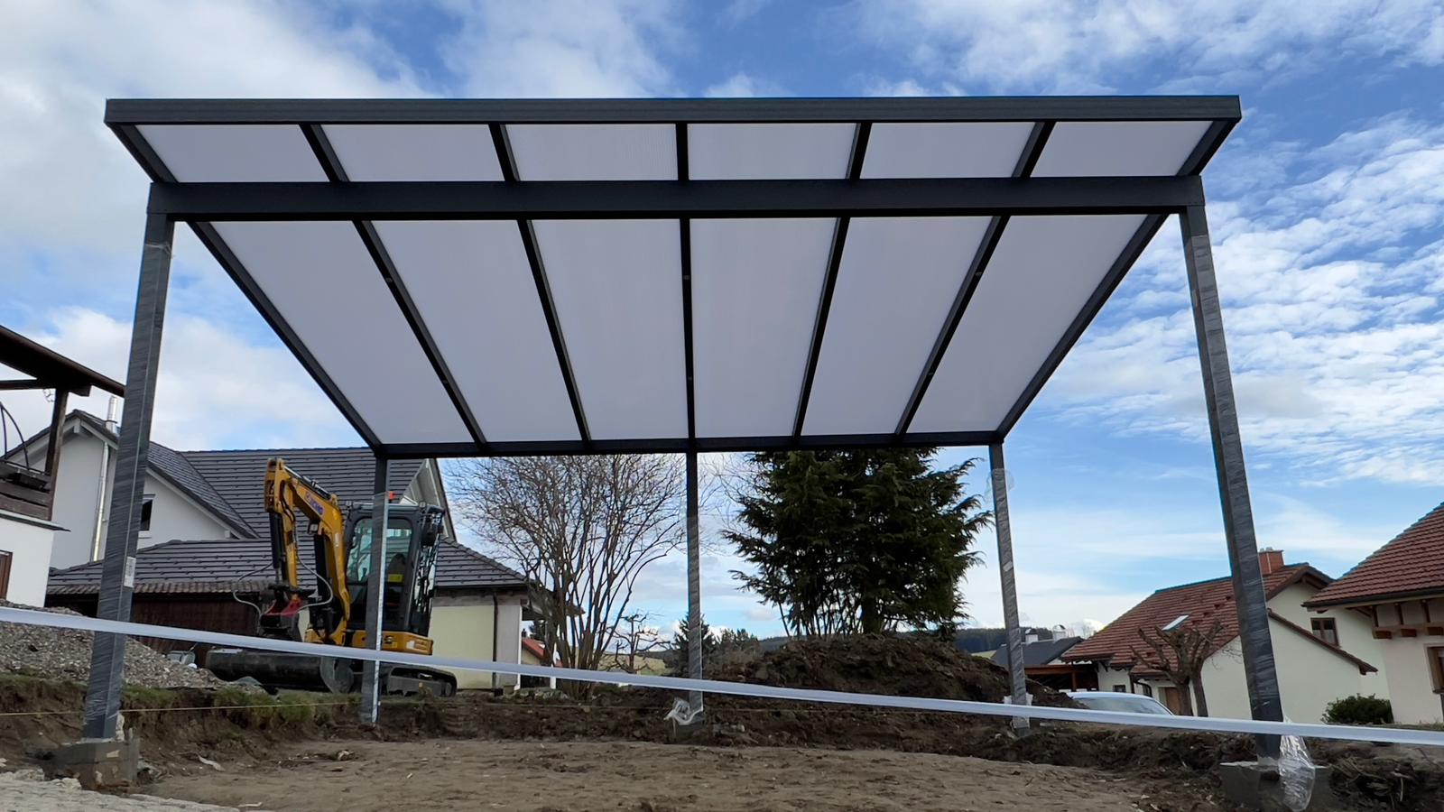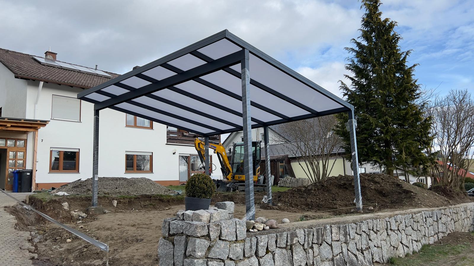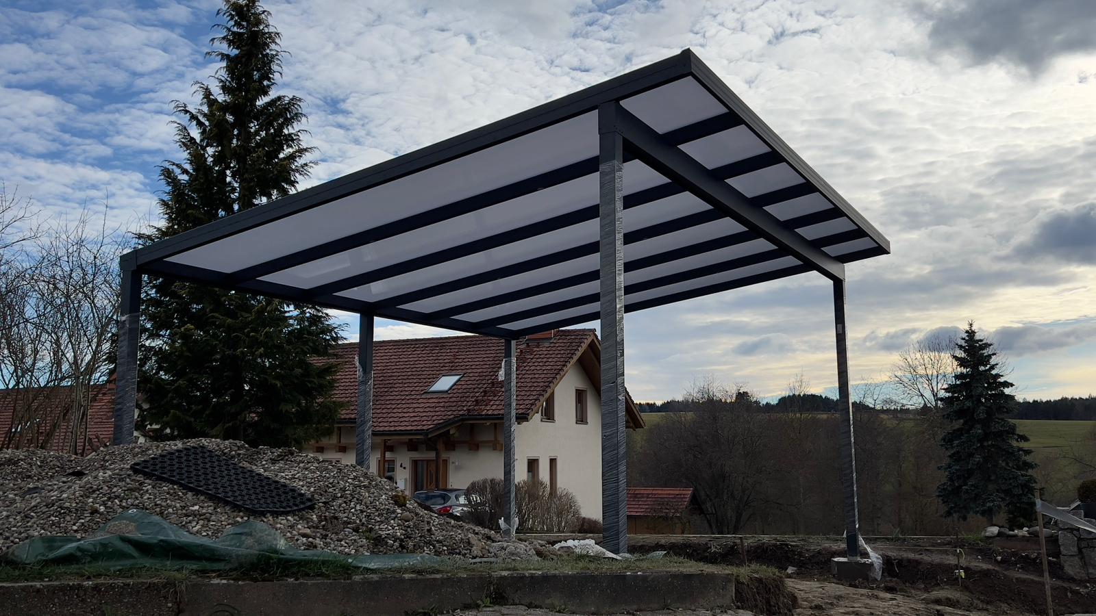 Dieses freistehende Carport in Trossingen überzeugt durch klare Linien, modernes Design und hochwertige Verarbeitung. Die stabile Aluminiumkonstruktion garantiert Langlebigkeit und Witterungsbeständigkeit. Dank der integrierten LED-Beleuchtung ist das Carport nicht nur tagsüber ein Blickfang, sondern auch nachts sicher und stilvoll ausgeleuchtet. Das Pultdach bietet optimalen Schutz für Fahrzeuge und harmoniert perfekt mit dem Umfeld des Einfamilienhauses.