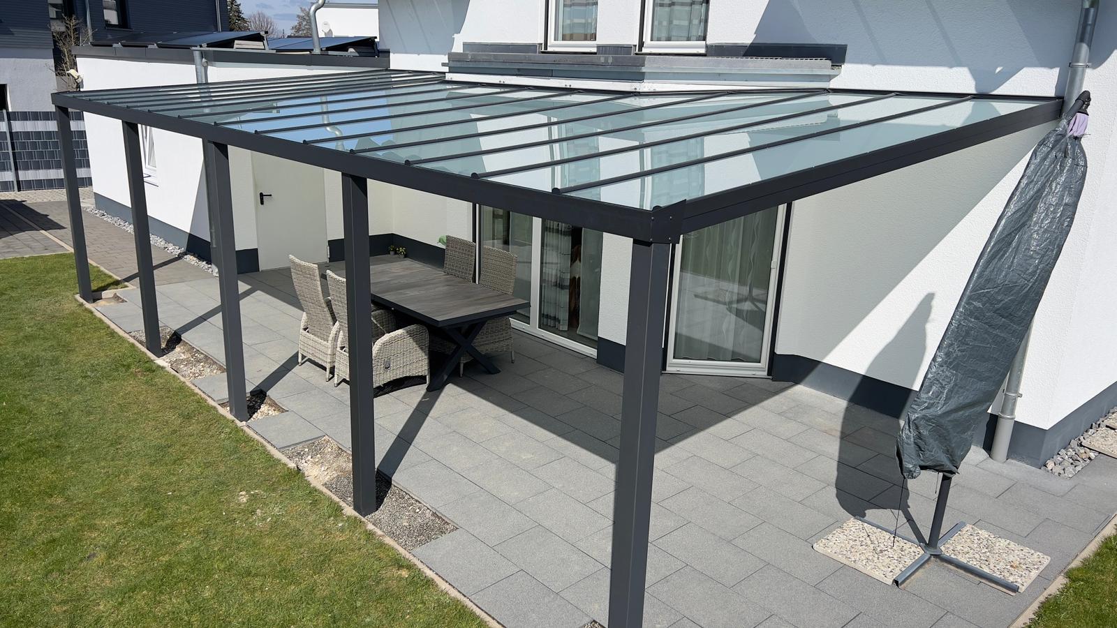 Diese großzügige Terrassenüberdachung in Spaichingen überzeugt durch modernes Design und hochwertige Verarbeitung. Die anthrazitfarbene Aluminiumkonstruktion ist robust, witterungsbeständig und pflegeleicht. Das matte VSG-Glas sorgt für angenehmes Licht auf der Terrasse, während die stabilen Träger und klare Linienführung für Eleganz und moderne Architektur stehen. So entsteht ein komfortabler Außenbereich, der Schutz vor Sonne und Regen bietet und gleichzeitig stilvoll das Haus ergänzt.